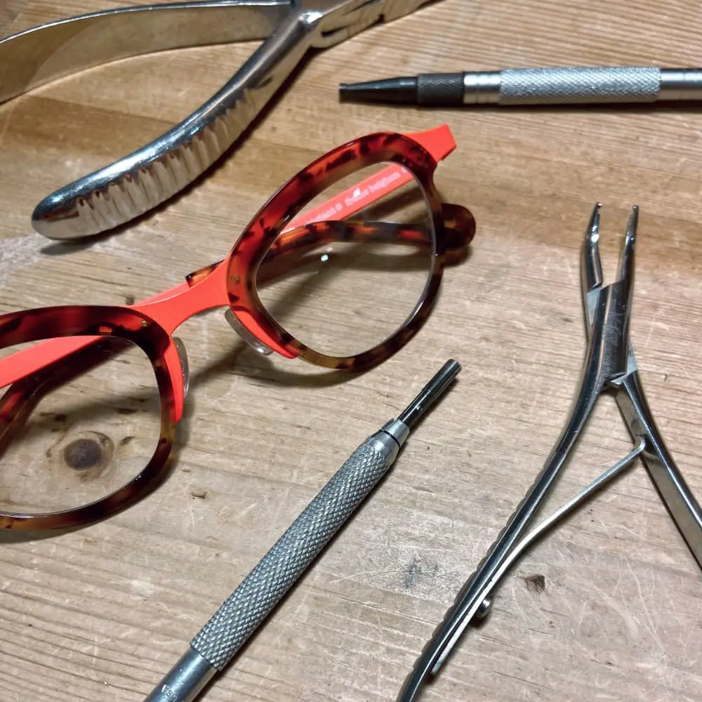 Plastic frames are often hard to repair, but when we do it we use a metal post and adhesive combo to fix broken plastic bridges and rims. *This service is usually reserved for last resort emergency repair and for temporary use.